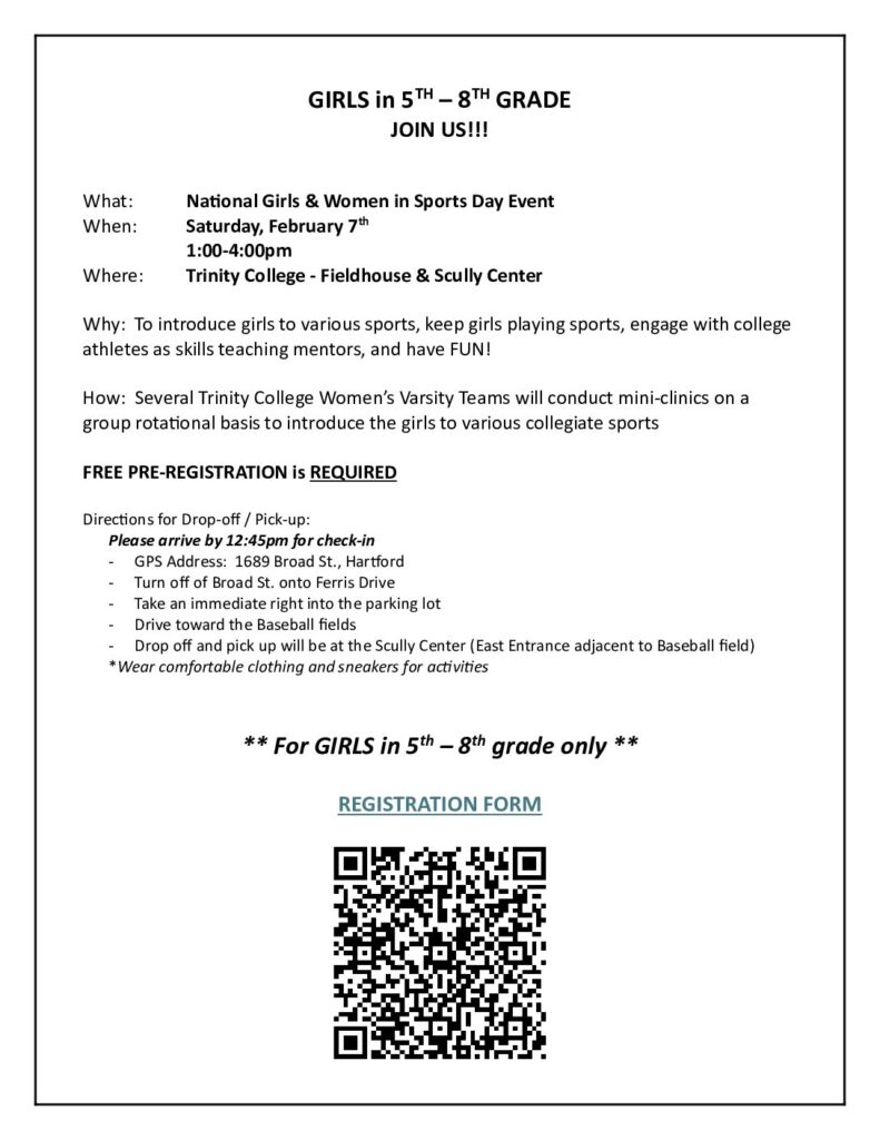 Trinity College Athletics is conducting a National Girls & Women in Sports Day on Saturday, February 7 (see attached details and registration form), and we invite to you attend!