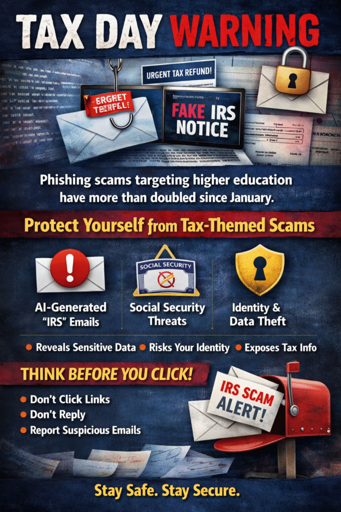 Phishing emails about tax refunds are increasing in higher education. Scammers target messages about refunds or urgent tax issues because they seem credible. Understand why this matters and what signs to watch for.