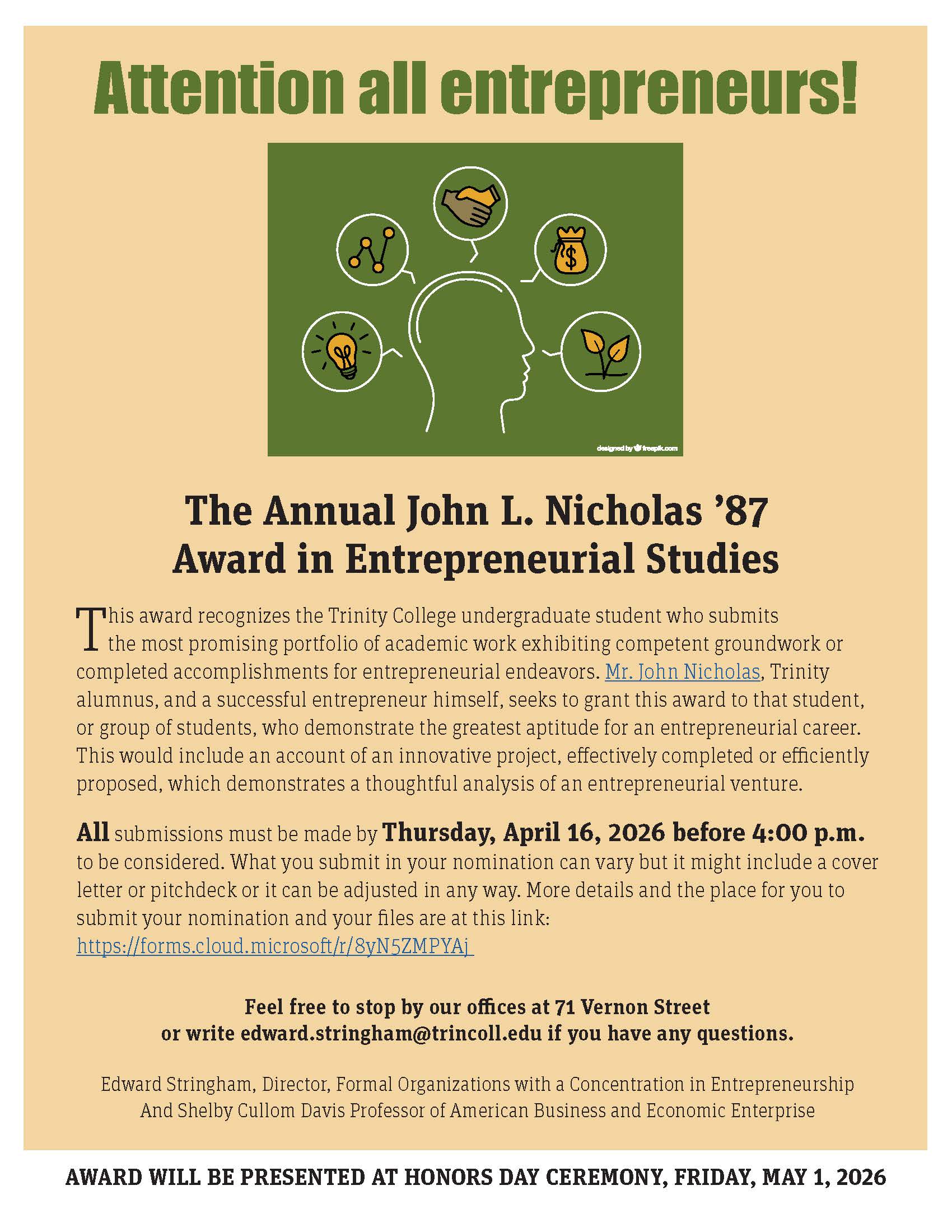 This award recognizes the Trinity College undergraduate student who submits the most promising portfolio of academic work exhibiting competent groundwork or completed accomplishments for entrepreneurial endeavors.